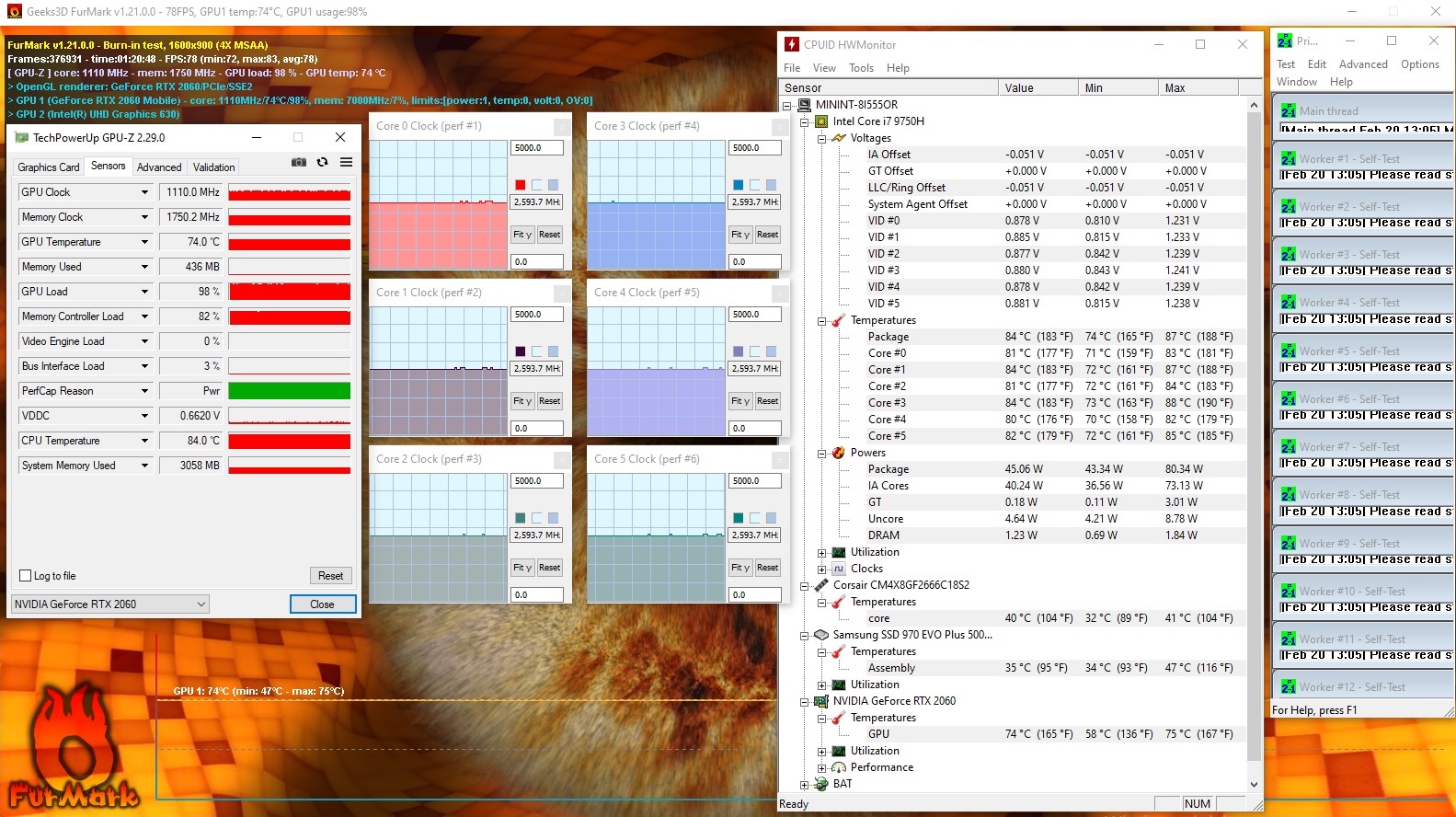 Utilizamos las herramientas FurMark y Prime95 durante casi 60 minutos, para determinar los valores máximos de temperatura de la CPU y la GPU. Mientras que el Core i7-9750H permaneció por debajo de los 90 °C, la GeForce RTX 2060 nunca superó los 75 °C.