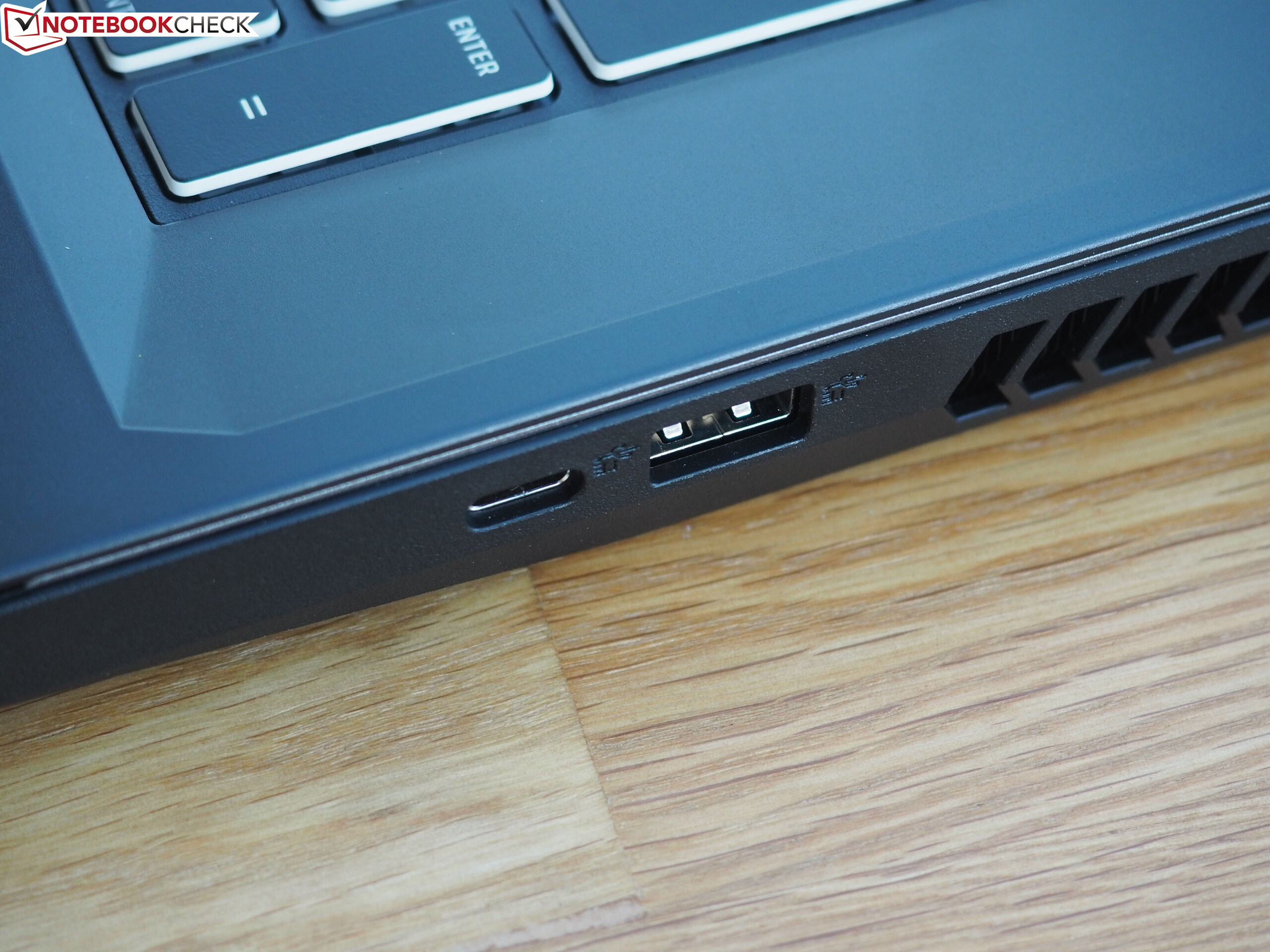 La amplia selección de puertos es una de las mayores ventajas del XMG Pro 17. Gracias al puerto HDMI, el Mini DisplayPort y dos puertos USB tipo C 3.1 Gen2 (1x Thunderbolt 3, 1x DisplayPort), los usuarios pueden, en teoría, conectar hasta cuatro monitores. Además, hay tres puertos USB tipo A 3.0, dos tomas de audio, un puerto RJ45 y una ranura de bloqueo Kensington. Además, hay un lector de tarjetas (algo difícil de alcanzar) oculto en el borde frontal del chasis. Como apenas hay puertos a la izquierda y a la derecha, debería haber suficiente espacio para que los usuarios puedan utilizar un ratón externo sin ser obstruidos.