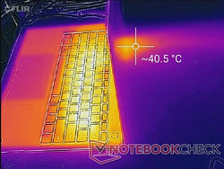 Las temperaturas de la superficie son generalmente más cálidas en el MateBook X Pro en comparación con el MateBook X, a pesar de la solución de enfriamiento más capaz. La parte inferior del portátil ya está razonablemente caliente a unos 30 C inactivo. En el juego, las superficies pueden ser tan cálidas como 48 C frente a sólo 41 C en el modelo del año pasado. Definitivamente podemos ver por qué Huawei tuvo que espesar el diseño e incorporar un ventilador con disipadores de calor más grandes. Los apoyos para la palma de la mano y el trackpad permanecen relativamente fríos sin importar la carga de trabajo, pero recomendamos un escritorio plano si se está jugando porque las superficies se calientan muy rápidamente. Asegúrese de dejar suficiente espacio para la ventilación a través de la esquina trasera de la unidad.