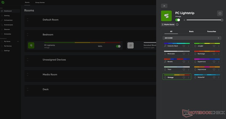 El panel de control permite a los usuarios asignar el kit de reflejo de pantalla a habitaciones y grupos. Al hacer clic en el dispositivo se revelan algunas escenas básicas y opciones reactivas a la música. Otras pestañas incluyen Gaming, donde la tira de luces puede reflejar cualquier cosa en una pantalla. Las integraciones disponibles son Overwolf y Razer Chromaque admiten respuestas a eventos del juego.