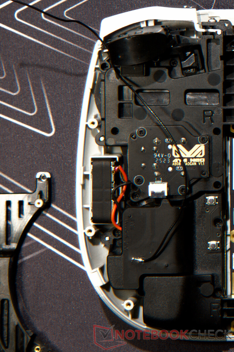 Desmontar la Ayaneo Kun no es realmente fácil. En primer lugar, hay que retirar las dos cubiertas de agarre de la parte trasera. También hay que retirar la tira situada entre los botones de los hombros, lo que deja al descubierto los tornillos que hay que quitar. Para acceder a todas las conexiones del interior, hay que quitar más tornillos y desenchufar algunos cables planos. Hay que prestar especial atención al cable plano del sensor de huellas dactilares. Aunque es lo suficientemente largo como para retirar con seguridad la carcasa inferior, podría dañarse fácilmente al doblarlo. Para acceder a la unidad SSD M.2-2280 NVMe, primero hay que retirar la placa de conexión para el lector de tarjetas microSD y la tarjeta SIM. Al igual que con el Air 1Shay una pegatina de garantía en uno de los tornillos, pero puede retirarse por completo con facilidad. El módulo WLAN también puede sustituirse, pero está instalado aún más profundo. También hay que retirar el ventilador y el marco de plástico para acceder a la tarjeta enchufable. La conexión para el módem LTE no se utiliza en nuestro caso pero podría instalarse posteriormente. Sin embargo, no vimos ninguna antena correspondiente premontada en nuestro dispositivo de prueba. Para los dispositivos de mano más antiguos, Ayaneo ofrece muchas piezas de repuesto de en su propia tienda. Seguro que pronto llegarán piezas para el Ayaneo Kun.
