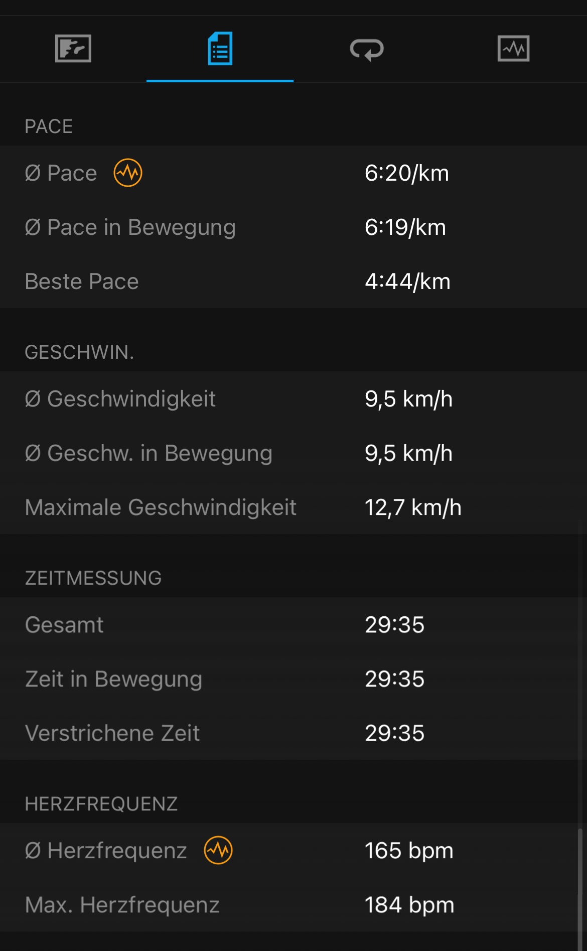 Las capturas de pantalla siguientes representan un registro de carrera en la aplicación y en el reloj. En la aplicación, el mapa muestra alternativamente las diferencias de altitud junto con el ritmo, que puede verse en la segunda captura de pantalla, o la tendencia de la frecuencia cardíaca. En el modo apaisado, los tiempos de las vueltas se complementan con detalles adicionales como el desnivel, la frecuencia y la longitud de las zancadas, así como el ritmo medio y máximo en las vueltas individuales.