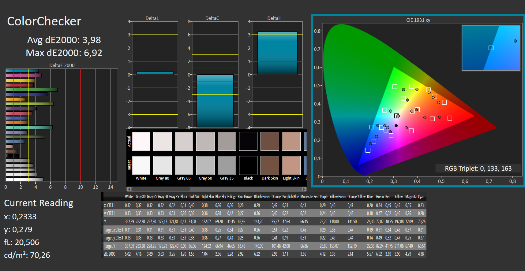 | Colorchecker dE 2000 max. * | 6.92 | 7.4 -7% | 18.9 -173% | 20.37 -194% | 2.4 65% | 17.08 -147% |