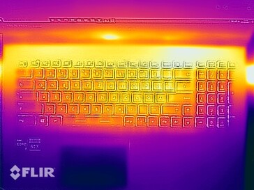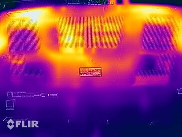 El WE76 no tiene problemas de temperatura, ya que toda la carcasa permanece muy fresca durante las tareas sencillas. Aunque hay una zona en la parte trasera izquierda de la parte inferior bajo carga donde podemos medir más de 55 °C, no vemos esto como un problema ya que casi nunca usarás esta estación de trabajo móvil en tu regazo. El teclado también se calienta notablemente bajo carga, pero el tecleo no se ve afectado.