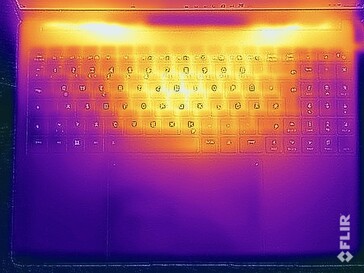Aunque no hay problemas de temperatura en el funcionamiento cotidiano, no debes colocar el dispositivo sobre tus rodillas cuando juegues o los componentes estén sometidos a una carga elevada. En el caso extremo, medimos temperaturas superiores a 50 °C (122 °F) en la zona central de la parte inferior. El área central del teclado también se calienta a más de 45 °C (113 °F), lo que se nota al escribir. Pero las típicas teclas WASD permanecen bastante más frías, lo que ayuda durante los juegos. El cargador, considerablemente más compacto, sólo se calienta marginalmente más que el del modelo antiguo, y no hay problemas con una temperatura máxima de 44 °C (111 °F).