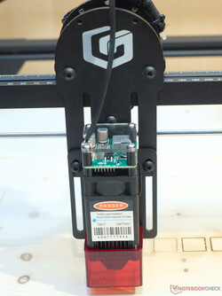 El módulo láser de 5,5 vatios impresiona por sus buenos resultados durante la prueba. Probablemente también sea responsable de ello un punto de luz especialmente estrecho en el foco. Longer especifica aquí una superficie base cuadrada de 0,08 × 0,08 mm. Dado que el láser tiene un enfoque fijo, el cabezal del láser debe ajustarse en función de la altura del objeto. Lamentablemente, esto no puede hacerse sin herramientas. Para ello, hay que aflojar los tornillos de montaje de ambos lados del láser con una de las llaves Allen incluidas. Un cilindro de aluminio incluido ayuda a encontrar la altura correcta. A continuación, se pueden volver a apretar los dos tornillos. El proceso se complica un poco por la pantalla de luz roja.