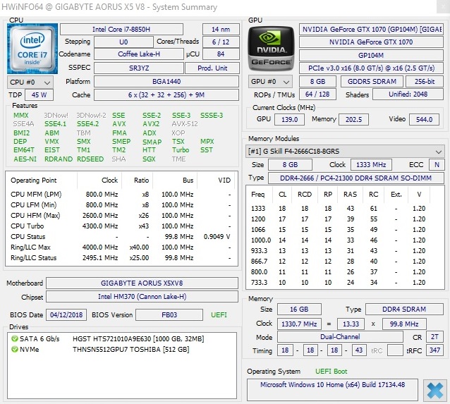 | Aorus X5 v8 GeForce GTX 1070 Mobile, i7-8850H | Gigabyte Aero 15X v8 GeForce GTX 1070 Max-Q, i7-8750H | MSI GS65 8RF-019DE Stealth Thin GeForce GTX 1070 Max-Q, i7-8750H | Asus Zephyrus M GM501 GeForce GTX 1070 Mobile, i7-8750H | Acer Predator Triton 700 GeForce GTX 1080 Max-Q, i7-7700HQ | Media de la clase Gaming | |
