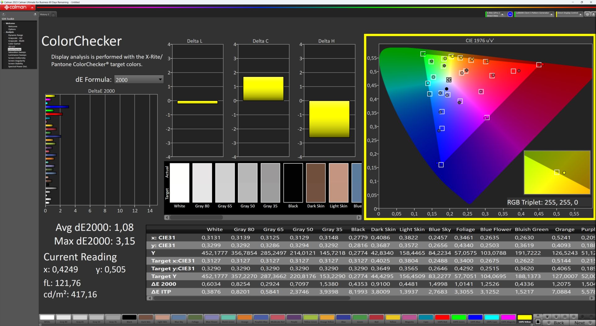 | Colorchecker dE 2000 calibrated * | 1.08 | 1.02 6% | 2.13 -97% | 0.77 29% | 0.61 44% | 0.66 39% |