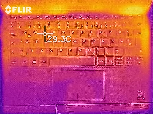 Nuestras mediciones muestran que el Dell XPS alcanza temperaturas superficiales de hasta 34 °C bajo carga. El punto más cálido está en la parte trasera del centro, pero el reposamanos siempre permanece fresco. Esto también permite usar el portátil bajo carga como en el regazo, por ejemplo