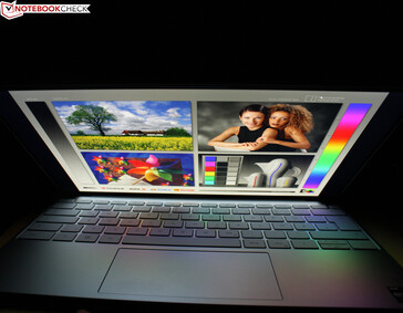 Nuestro XPS 9315 usa la pantalla Sharp por defecto con una resolución de 1920 x 1200 píxeles y el panel IPS LQ134N1 que muestra un ligero sangrado de la luz de fondo cerca del borde superior cuando se muestra una imagen completamente negra a máximo brillo. Aunque el brillo de 442 nits (promedio) es alto, no llega a los 500 nits declarados por el fabricante (sólo medimos hasta 466 nits).