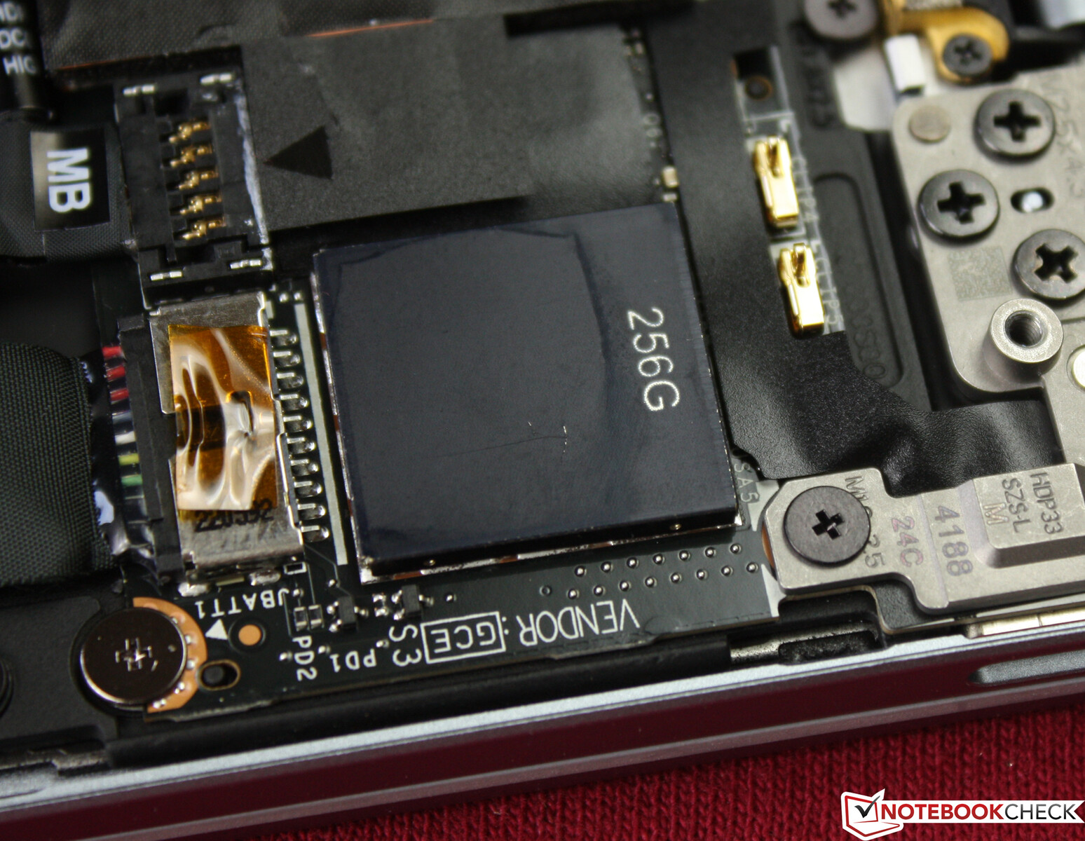 La bisagra puede abrirse hasta un ángulo máximo de unos 135 grados, donde se detiene bruscamente sin tambalearse. La tapa de aluminio es resistente a la torsión. Al aplicar presión en su parte trasera no se produce ningún tipo de cesión o distorsión en la pantalla. La cámara web se ha trasladado al bisel negro de la pantalla, haciéndola desaparecer visualmente. Sin embargo, la muesca de la webcam no sobresale en el área de la pantalla. Los biseles de la pantalla son muy pequeños, por lo que la relación pantalla-cuerpo es del 89%.