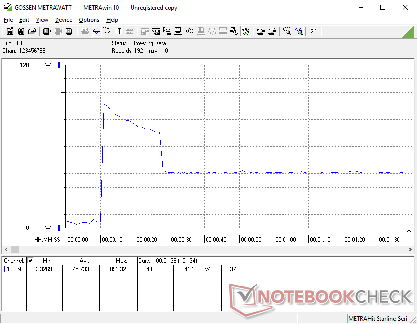 Somos capaces de registrar un consumo máximo temporal de poco más de 99 W del adaptador de CA de 120 W pequeño-mediano cuando se ejecutan cargas extremas, como muestran las imágenes de abajo. El adaptador puede suministrar más energía que en la mayoría de los otros Ultrabooks ULV donde los adaptadores de CA de <100 W son más comunes.