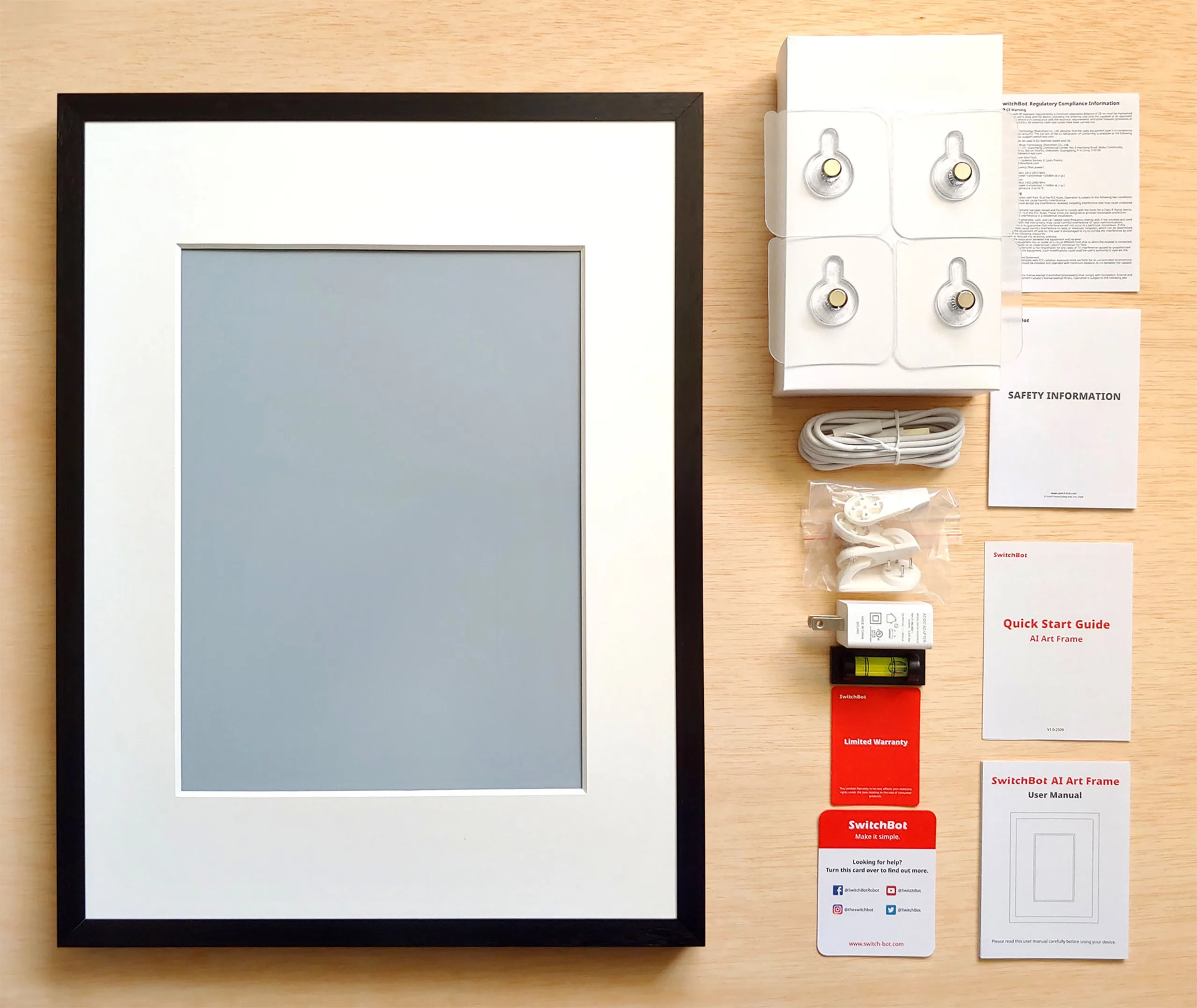 El paquete incluye un USB-C y un cargador, dos juegos de clips de montaje, un nivel de burbuja, tres alfombrillas de papel, una guía de inicio rápido, un manual de usuario, una tarjeta de asistencia y tres folletos de seguridad.