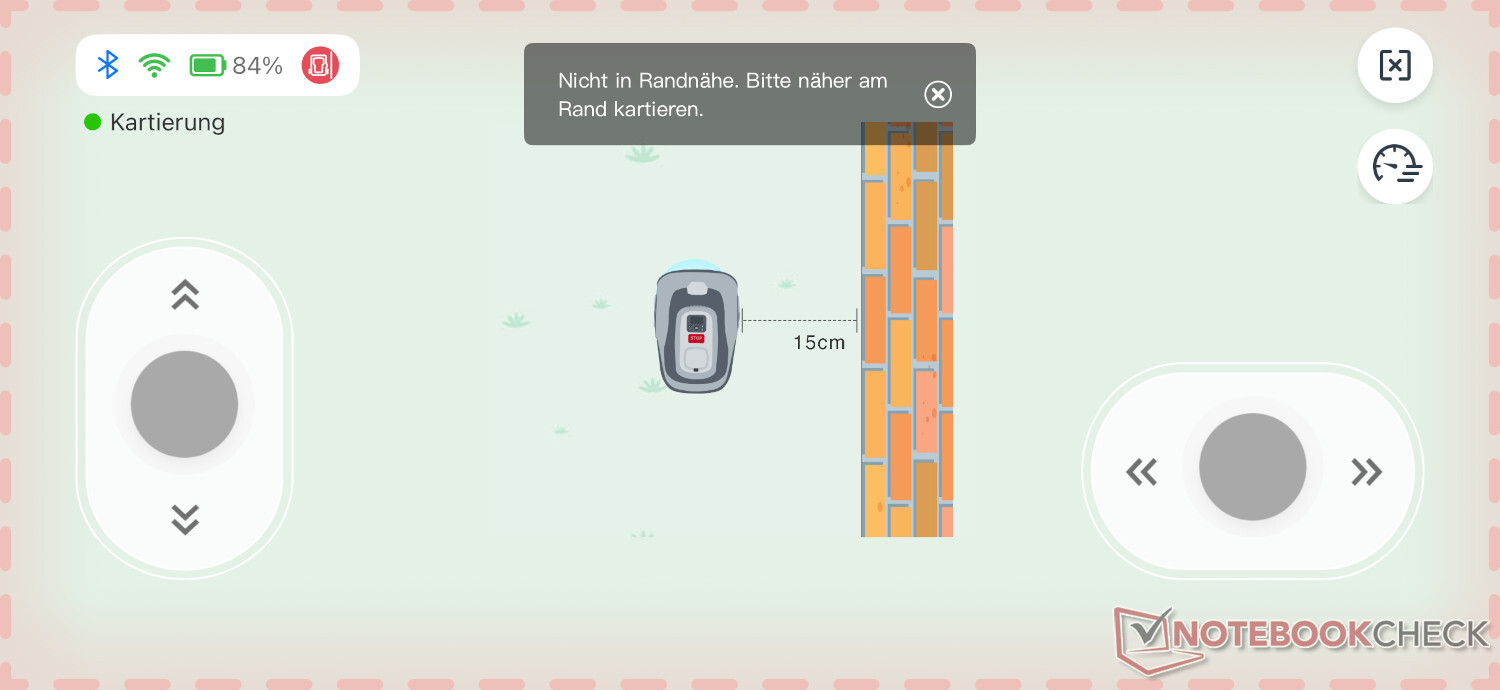 Alternativamente, también es posible el trazado manual. En este caso, el robot cortacésped se pilota durante una vuelta introductoria utilizando dos joysticks virtuales en la pantalla del smartphone. En principio, esto funciona bien, ya que los controles son agradables y no demasiado sensibles. Esto permite pilotar el robot cortacésped con precisión a lo largo de los límites del césped.