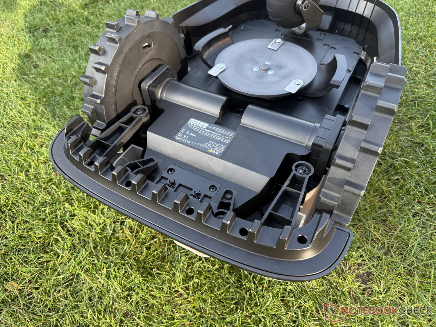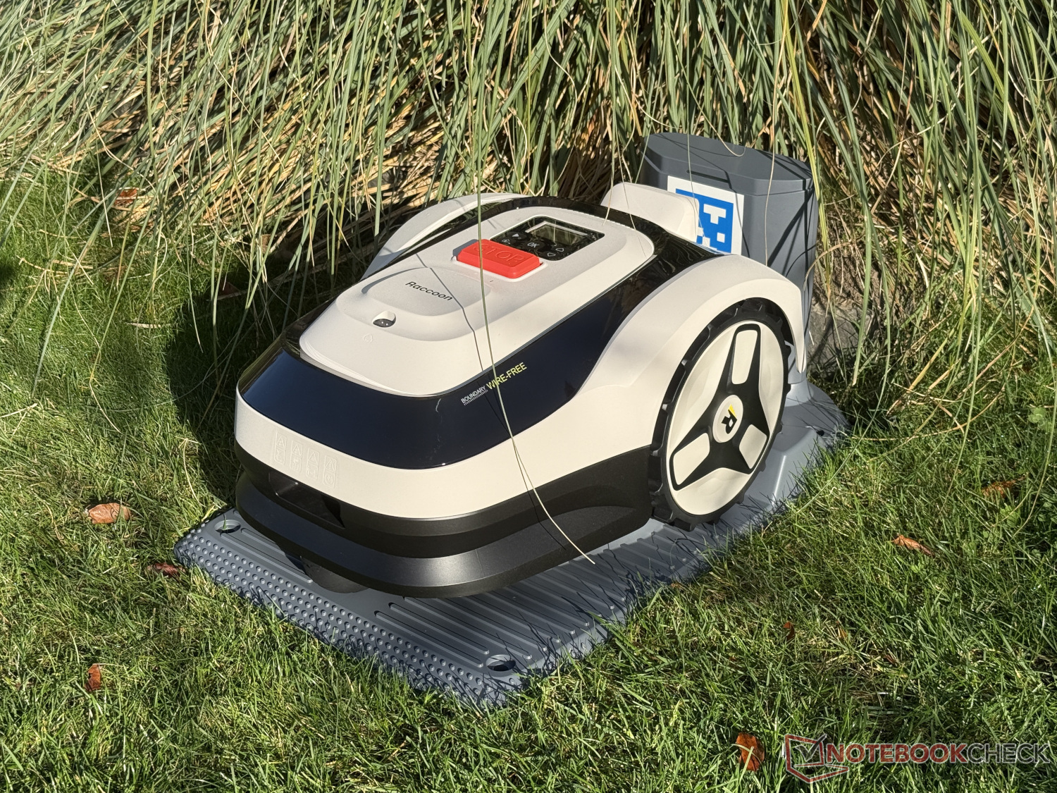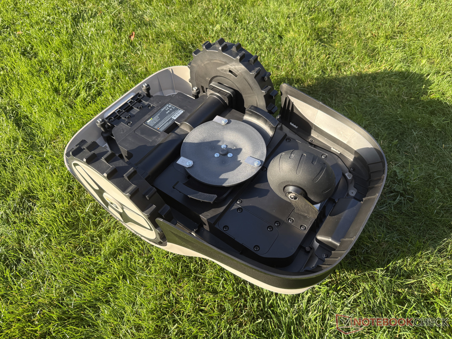 Mientras que la cámara se sitúa en una pequeña joroba y capta la zona situada delante del robot cortacésped, en la parte superior se encuentra una sencilla pantalla, cinco botones para su manejo, el obligatorio botón de parada en rojo brillante y un sensor de lluvia. En la parte trasera hay una práctica empuñadura empotrada que facilita el transporte del robot cortacésped, que pesa unos 12 kg. La mano de obra es buena, el diseño bastante sobrio en los colores de un mapache.
