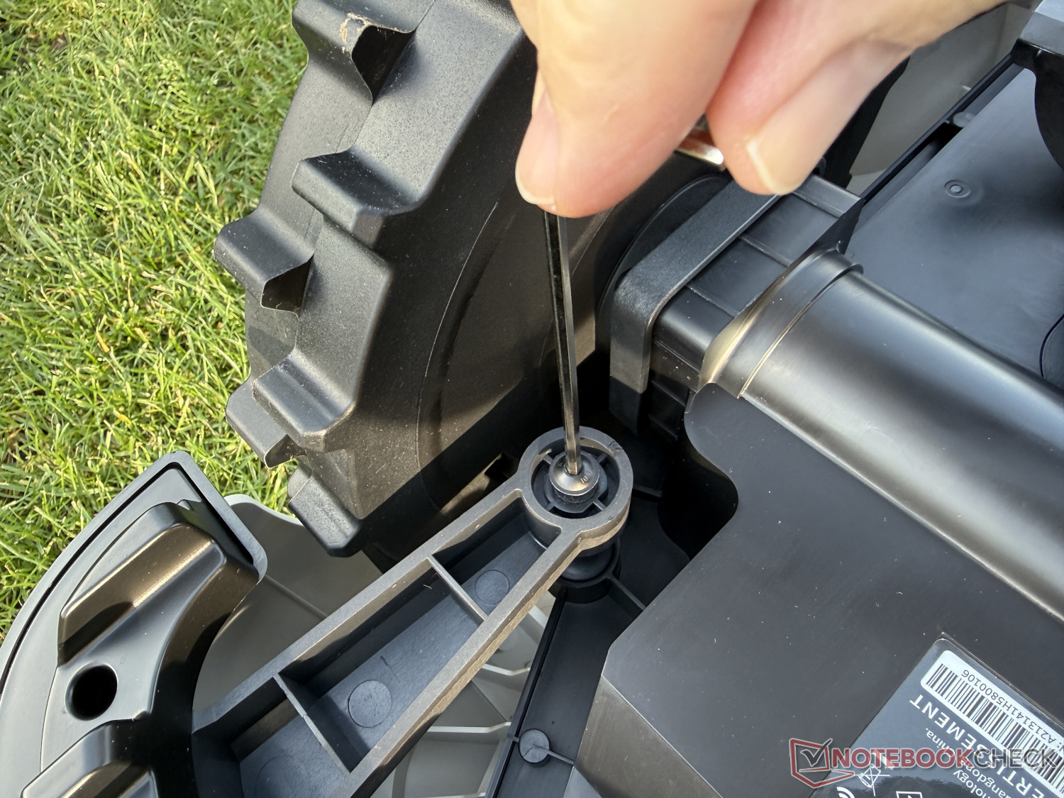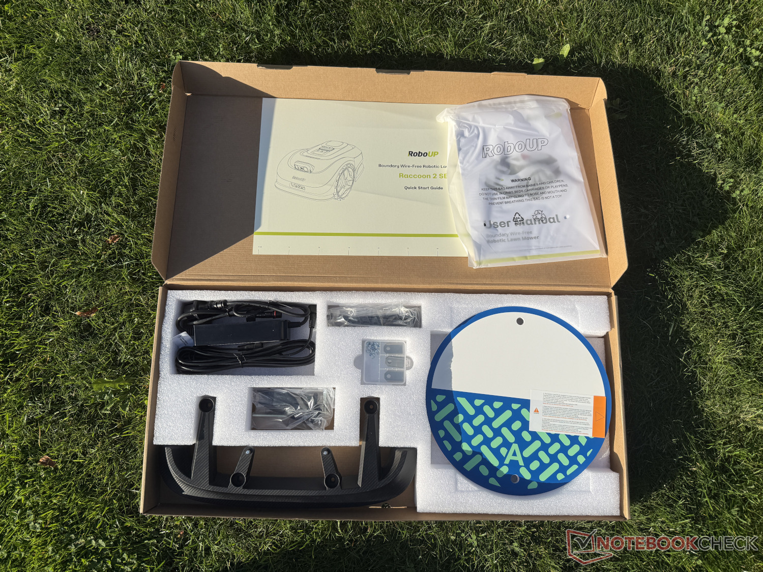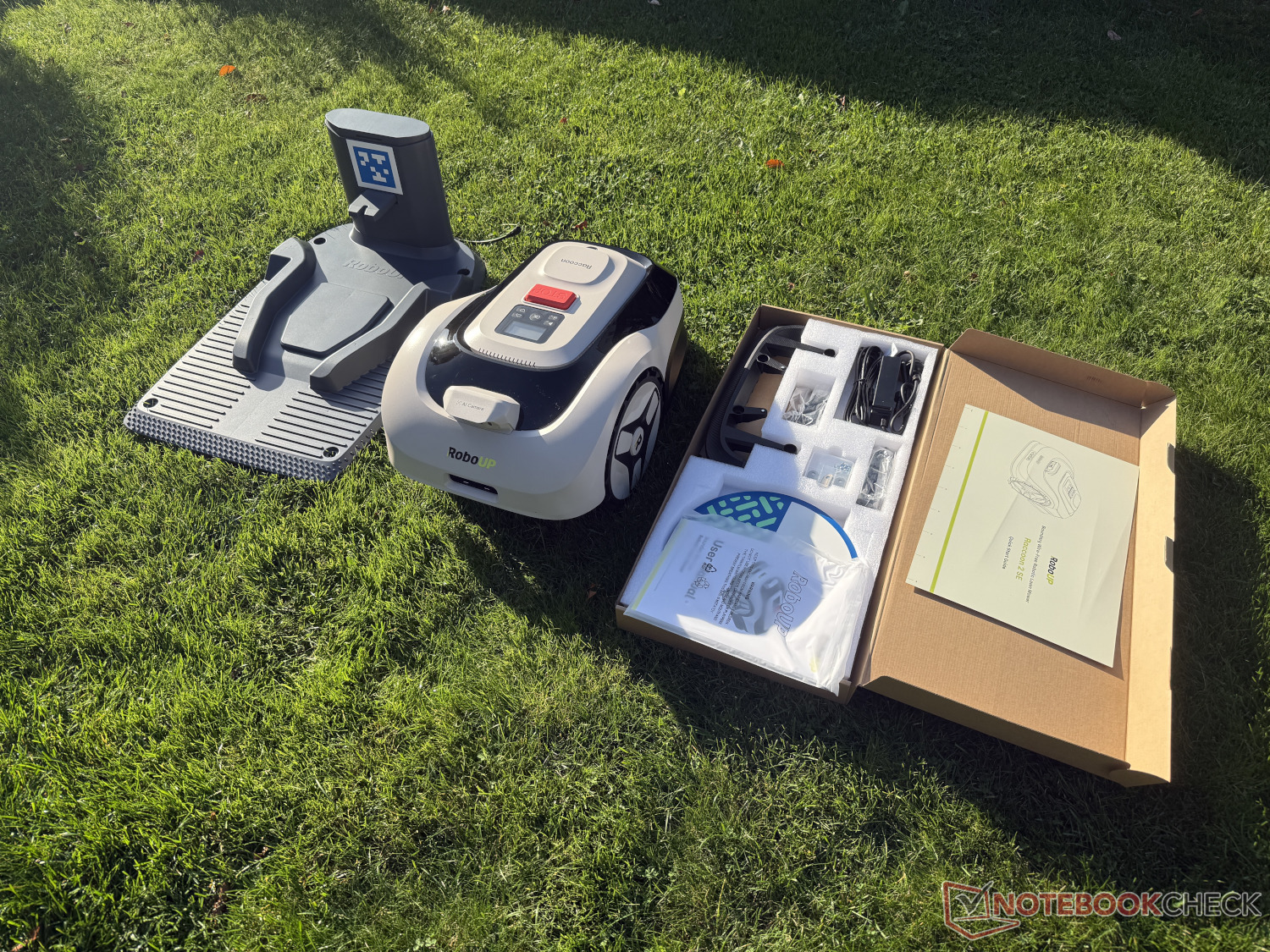 Antes de empezar a segar es necesario realizar algunos pasos. Además de instalar la estación de carga (conexión eléctrica y fijación con tornillos de tierra), hay que atornillar el parachoques delantero a la parte inferior del aparato a modo de parachoques. Se incluyen las herramientas necesarias, así como dos balizas (más información al respecto más adelante) y tres juegos de cuchillas de repuesto. El RoboUp Raccoon 2 SE está entonces listo para su uso.