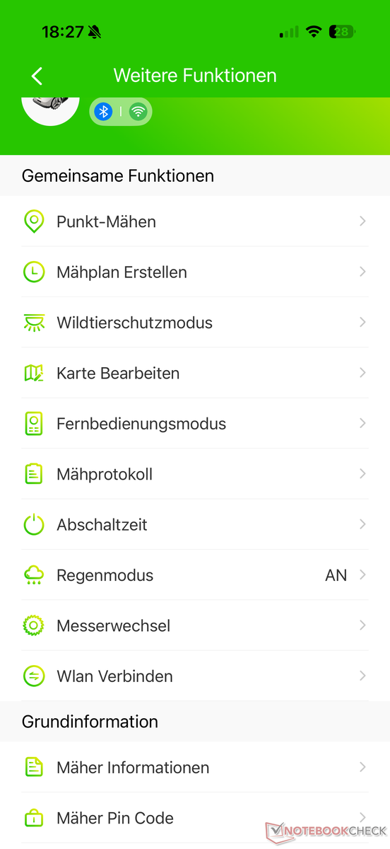 La zona de césped cartografiada puede verse en la vista general. Sin embargo, no proporciona ningún progreso en directo. Sólo puede ver las cifras del porcentaje de tiempo de corte y el tiempo de trabajo restante. Además de ver el estado de la batería, WLAN y Bluetooth, la aplicación también le permite ajustar el modo, la altura de corte, el modo de bordeado y la duración. Al cortar bordes, puede elegir cortar hasta el borde del césped o, en el caso de transiciones a ras de suelo, también puede conducir por el borde.
