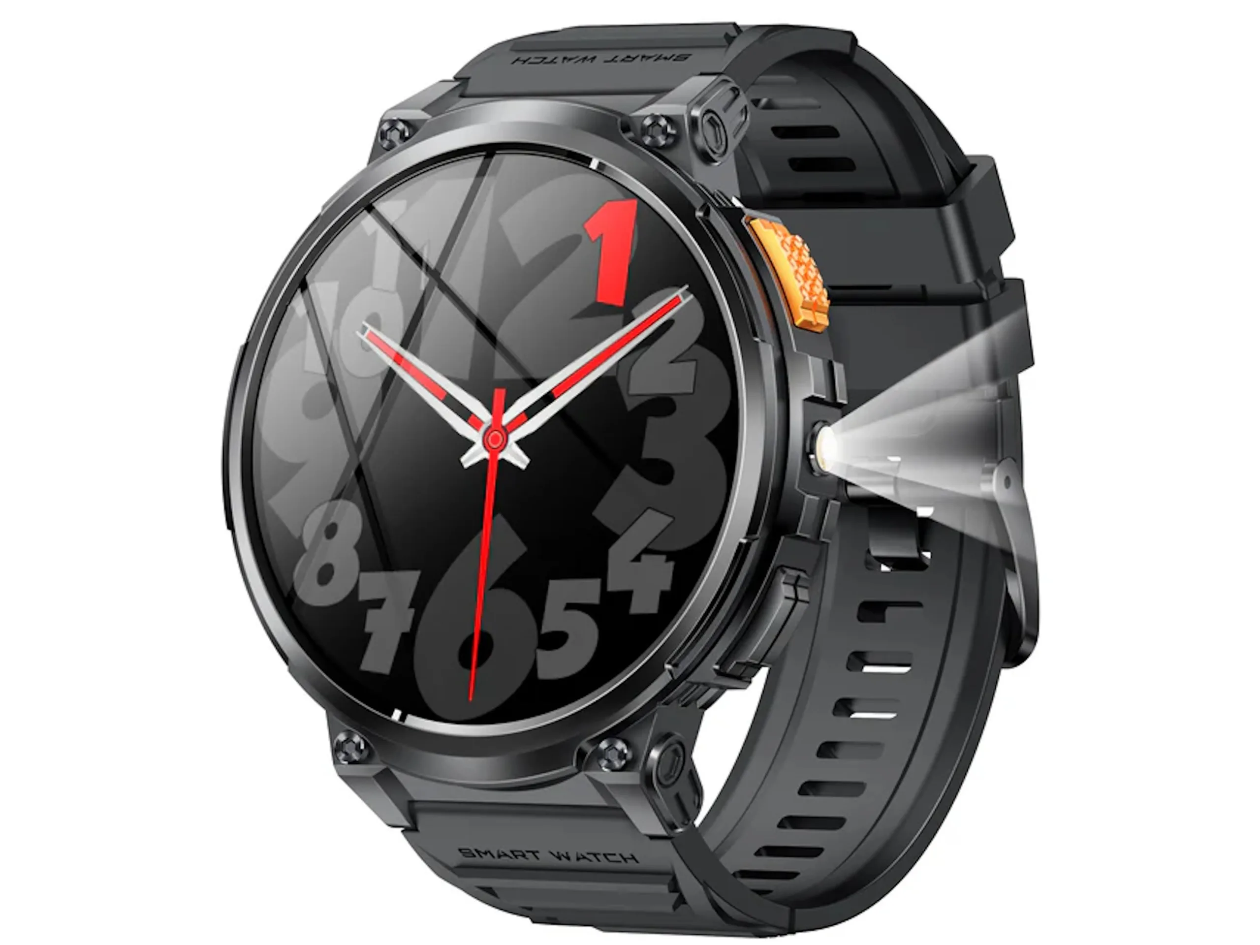 El smartwatch está equipado con una pantalla táctil AMOLED de 1,85 pulgadas, pero también dispone de botones para los usuarios de mentalidad más tradicional y para los casos en los que los usuarios tengan las manos mojadas, por ejemplo. No sólo hay dos botones situados en el lado derecho, sino también una linterna, que puede ser útil por la noche cuando se va de acampada o para los casos en los que los usuarios no tengan una linterna o una antorcha a mano.