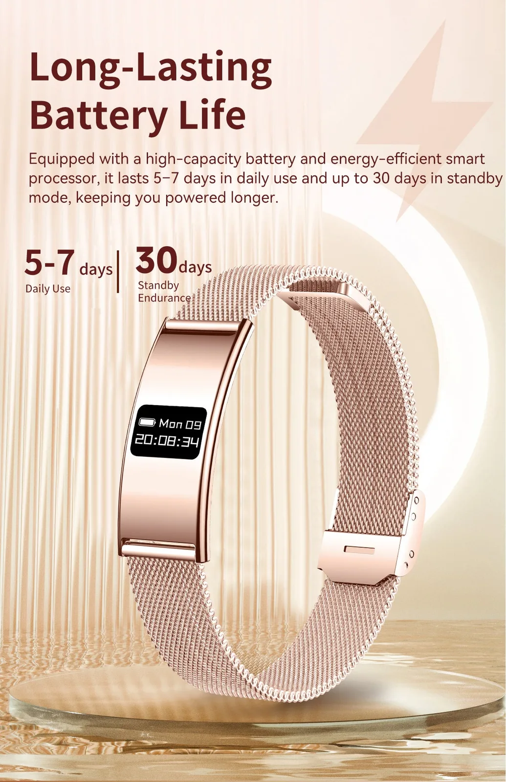Las delgadas pulseras inteligentes de metal se están convirtiendo más en una cuestión de cómo quedan en la muñeca que de cuántas funciones pueden incluir. RogbidVogue encaja perfectamente en ese espacio. Se comercializa como una pieza de joyería de uso cotidiano que también realiza un seguimiento de su salud. La empresa afirma que mide 2,8 mm de grosor, lo que la convierte en la pulsera inteligente para la salud más fina del mundo hasta el momento.