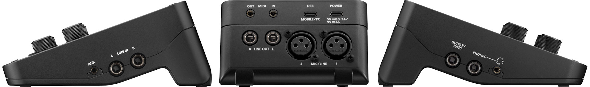 La Go:Mixer Studio admite dos entradas 1/4"/XLR con alimentación phantom, una entrada de guitarra/bajo, dos entradas de línea 1/4" (I/D), una entrada auxiliar 1/8" y una entrada de micro para auriculares. La interfaz emite audio analógico mezclado a través de las salidas de línea y de auriculares, o audio digital a 24 bits, 44,1 kHz a 192 kHz a través del puerto USB-C.