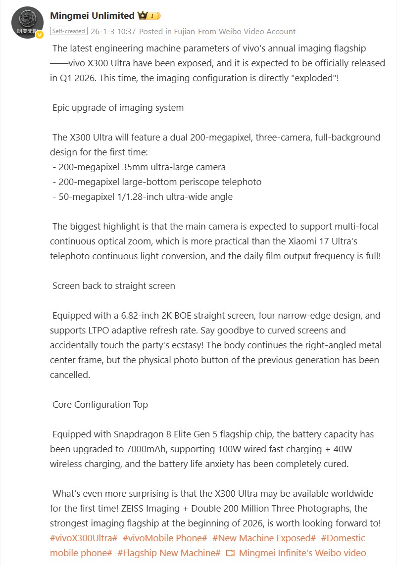 El primer fin de semana del año nos trae un rumor bastante espectacular sobre el Vivo X300 Ultra, que se espera que sea el primer buque insignia Vivo Ultra que se lance a nivel mundial y se prevé que debute en el primer trimestre, probablemente en marzo. Según un usuario de Weibo (ver captura de pantalla más abajo), el Vivo X300 Ultra contará con una cámara principal de 35 mm de 200 MP, una cámara teleobjetivo periscópica de 200 MP y una gran cámara ultra gran angular de 1/1,28 pulgadas y 50 MP, lo que no es precisamente información nueva.