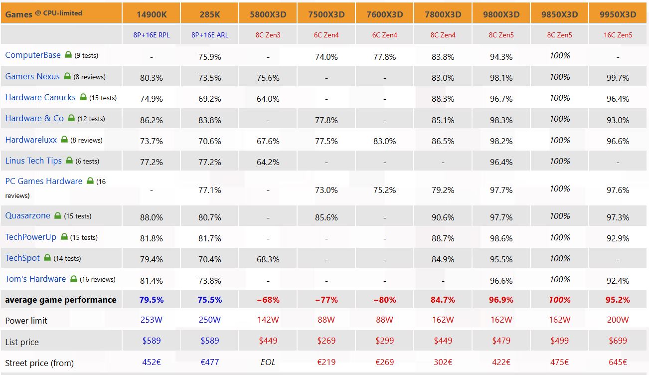 El recién lanzado Ryzen 7 9850X3D de 499 dólares es la CPU para juegos más rápida de AMD. Según el análisis de 3DCenter de 14 análisis de lanzamiento, el Ryzen 7 9850X3D es supuestamente alrededor de un 3,2% más rápido en juegos que el Ryzen 7 9800X3D, un 5% más rápido que el Ryzen 9 9950X3D, y un enorme 32% más rápido que el Core Ultra 9 285K. Sin embargo, el mayor rendimiento en juegos del Ryzen 7 9850X3D se produce a costa de un consumo de energía mucho mayor.