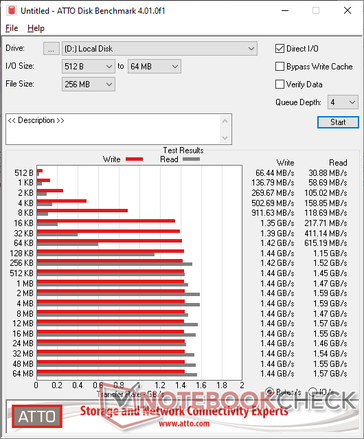 La prueba de referencia ATTO prueba varios tamaños de bloque de 512 bytes a 64 Megabytes para pintar un cuadro más amplio del rendimiento de los SSD. En este escenario, podemos ver que las tasas de lectura y escritura superan los 1,44 GB/s a 1,6 GB/s cada una con tamaños de bloque de 256 KB y superiores. En comparación, la Asura Genesis Xtreme, centrada en los juegos, alcanza los 3 GB/s, lo que implica que la Patriot SSD no está explotando plenamente la interfaz PCIe x4 debido a sus especificaciones presupuestarias.
