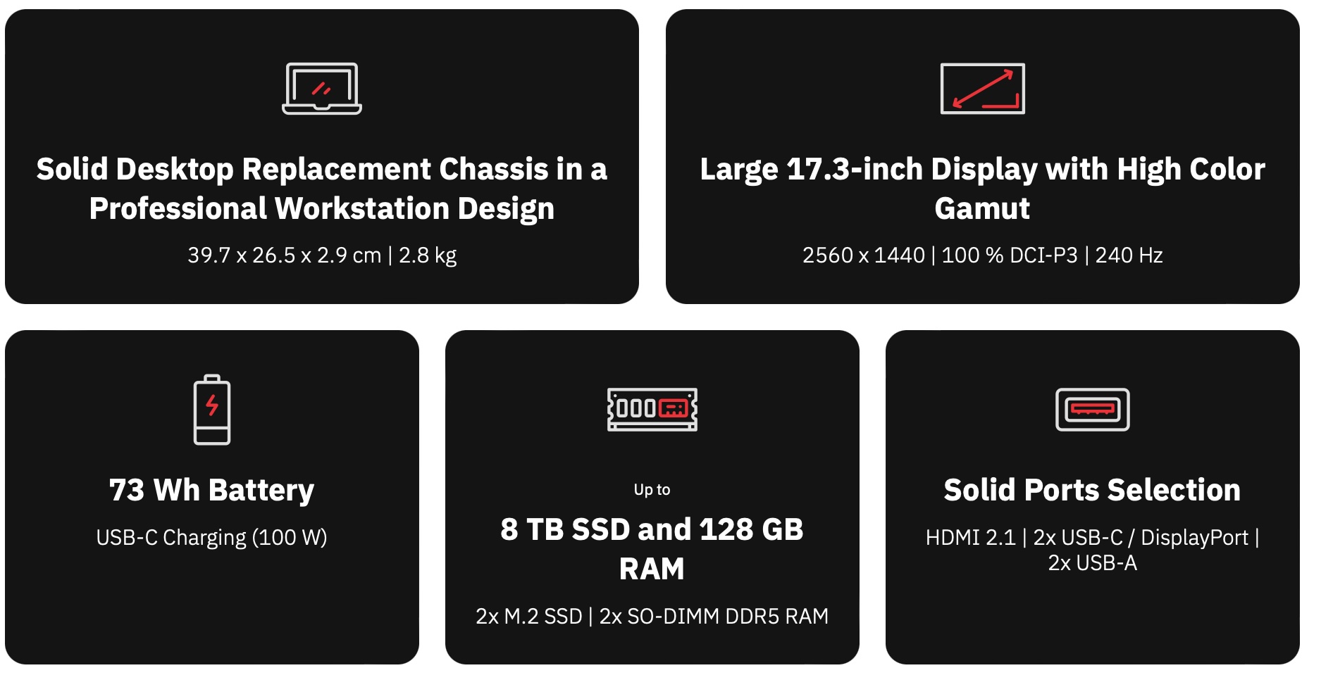 Otras características destacables son los altavoces duales de 2 W, una webcam FHD, batería de 73 Wh, bloqueo Kensington y un trackpad de 15 x 9 cm.