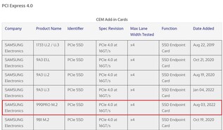 Sin embargo, desde entonces el listado PCI-SIG de https://pcisig.com/developers/integrators-list?field_il_comp_product_type_value=All&keys=samsung se ha modificado, y la Samsung 990 Pro sigue estando presente en la lista de integradores, pero ahora sólo en la tabla de PCIe 4.0 con la revisión de las especificaciones "PCIe 4.0 a 16GT/s". La entrada del Pro 990 en la sección PCIe 5.0 ha sido eliminada. Esta revisión podría haberse hecho simplemente para corregir un error, pero parece algo cuestionable que Samsung utilice términos de marketing tan hiperbólicos en su nuevo teaser ("Ultimate SSD", "Champion Maker") para una SSD PCIe 4.0 que puede ser sólo un poco mejor que la 980 Pro