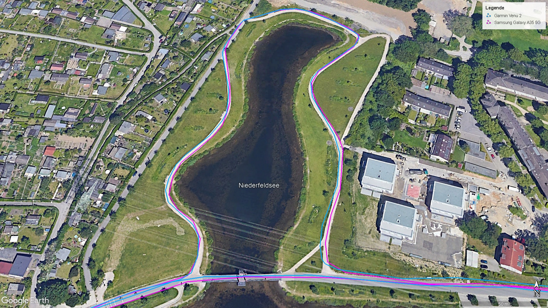 El smartphone superó la prueba práctica con sobresaliente y, con ello, ha demostrado ser muy adecuado para las tareas de navegación. Aparte de algunas pequeñas desviaciones, el Galaxy A35 registró con gran precisión una ruta de 10 kilómetros en bicicleta. Esto hace que sea tan preciso como el smartwatch de fitness Garmin Vent 2, que nos acompañó en la prueba con fines comparativos.