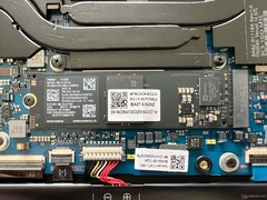 La cubierta de la unidad base se fija mediante cuatro tornillos Philipps normales que se ocultan bajo unos pies de goma. Afortunadamente, no están pegados y, por tanto, son fáciles de retirar. Además, la cubierta está fijada mediante clips, por lo que le recomendamos que utilice una pequeña ventosa para retirarla. Una vez dentro, nos sorprendió gratamente la presencia de una ranura M.2 2280 SSD libre en nuestra configuración de 512 GB, lo que hace que ampliar el espacio de almacenamiento sea bastante fácil y asequible. No se puede decir lo mismo de los módulos RAM y Wi-Fi, que están soldados.
