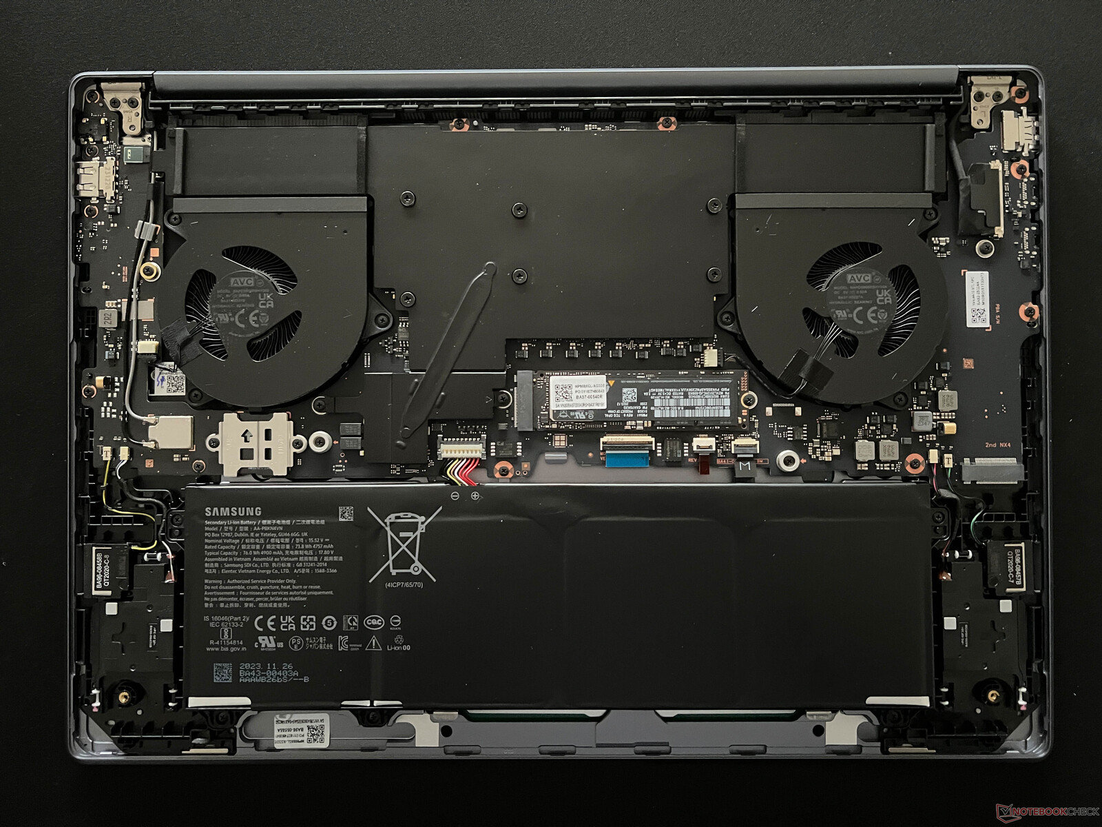 En la base de la unidad, hay cuatro tornillos ocultos bajo las patas de goma instaladas. Pero, incluso sin los tornillos, la tapa de la base está asegurada con mucha firmeza, ya que hay clips de fijación adicionales en el centro. En el interior del aparato, se enfrenta a los dos ventiladores y a la gran cámara de vapor. Hay dos ranuras para SSD M.2 2280 y, aunque la batería atornillada puede sustituirse, todos los demás componentes están soldados.