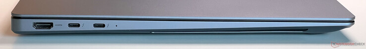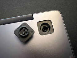 Además de las modernas interfaces USB-C que incluyen Thunderbolt 4, la Galaxy Book4 Ultra también ofrece un puerto USB-A normal, así como HDMI 2.1. Sin embargo, una de las interfaces USB también se puede utilizar para la fuente de alimentación. No se pueden hacer quejas sobre la ubicación de los puertos en ambos lados traseros del dispositivo. El conector HDMI se conecta directamente a la GPU Nvidia, pero no los dos puertos USB-C. Cuando se utiliza un monitor externo, la dGPU no siempre funciona automáticamente de forma simultánea.