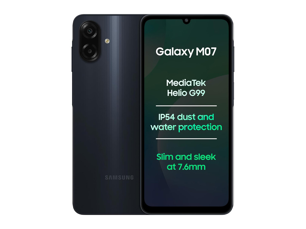 EN→ESThe Samsung Galaxy M07 was announced on October 1, 2025, and released the same day, aiming to offer a budget-friendly option with solid everyday performance. It comes in a sleek black color, weighing 184 grams and measuring 167.4 x 77.4 x 7.6 mm, making it comfortable to hold. The phone has a glass front with a plastic back and frame, and it carries an IP54 rating, which provides basic dust protection and splash resistance. The phone sports a 6.7-inch PLS LCD display with a 720 x 1600 pixels resolution and around 262 ppi density. While the resolution is modest, the 90Hz refresh rate ensures smooth scrolling and a decent visual experience for daily use. Peak brightness is enough for indoor and moderate outdoor use, though it may struggle under direct sunlight.