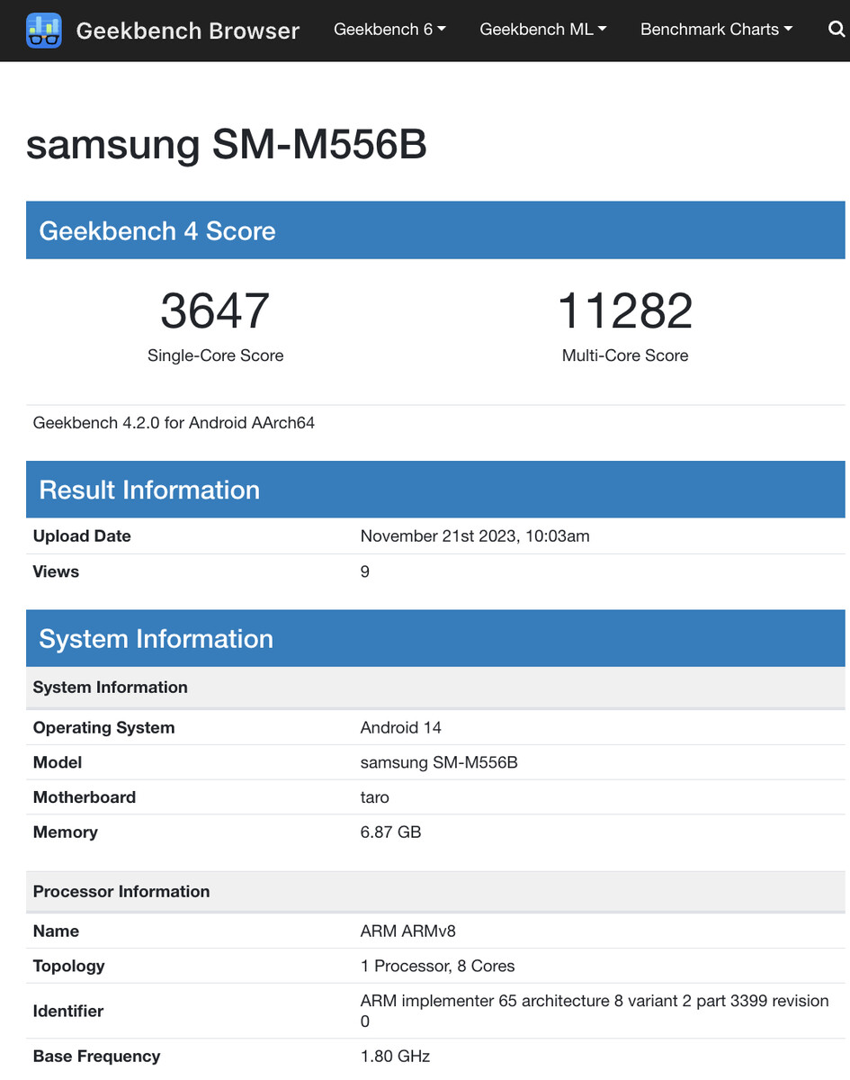 En concreto, el SM-M556B es la continuación directa del SM-M546B, un número de modelo que Samsung asignó al Galaxy M54. Por tanto, el SM-M556B debería ser el Galaxy M55, que Samsung precarga con Android 14. Aunque Geekbench no lo confirma, cabría esperar que Samsung anunciara el Galaxy M55 con One UI 6 y no con Android 14 directamente.