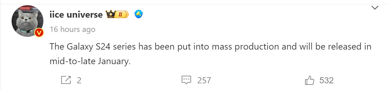 En la actualidad, al menos en China, muchos ya están anticpando con impaciencia el Xiaomi 14. El Honor Magic6 también ha completado su primera ronda oficial en forma de anuncio anticipado de algunas características, pero a nivel internacional, el primer smartphone de Samsung de 2024 será probablemente el que tenga más peso y parece que se lanzará antes que nunca. Según los rumores, el evento de lanzamiento Unpacked tendrá lugar el 18 de enero de 2024 en California y, por tanto, justo ante los ojos de Apple. El conocido filtrador chino Ice Universe lo confirmó recientemente en la red china Weibo, donde también anunció que la producción en masa comenzaría mucho antes que en años anteriores, lo que significa que un lanzamiento del Galaxy S24 a mediados o finales de enero bien podría ser posible.