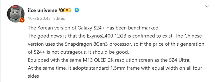Según Ice Universe, el Galaxy S24 Plus estará equipado con sólo un marco de 1,5 mm alrededor del panel Samsung M13 AMOLED, que se supone que es exactamente el mismo panel QHD que el Galaxy S24 Ultra, tal y como indicado en anteriores filtraciones.