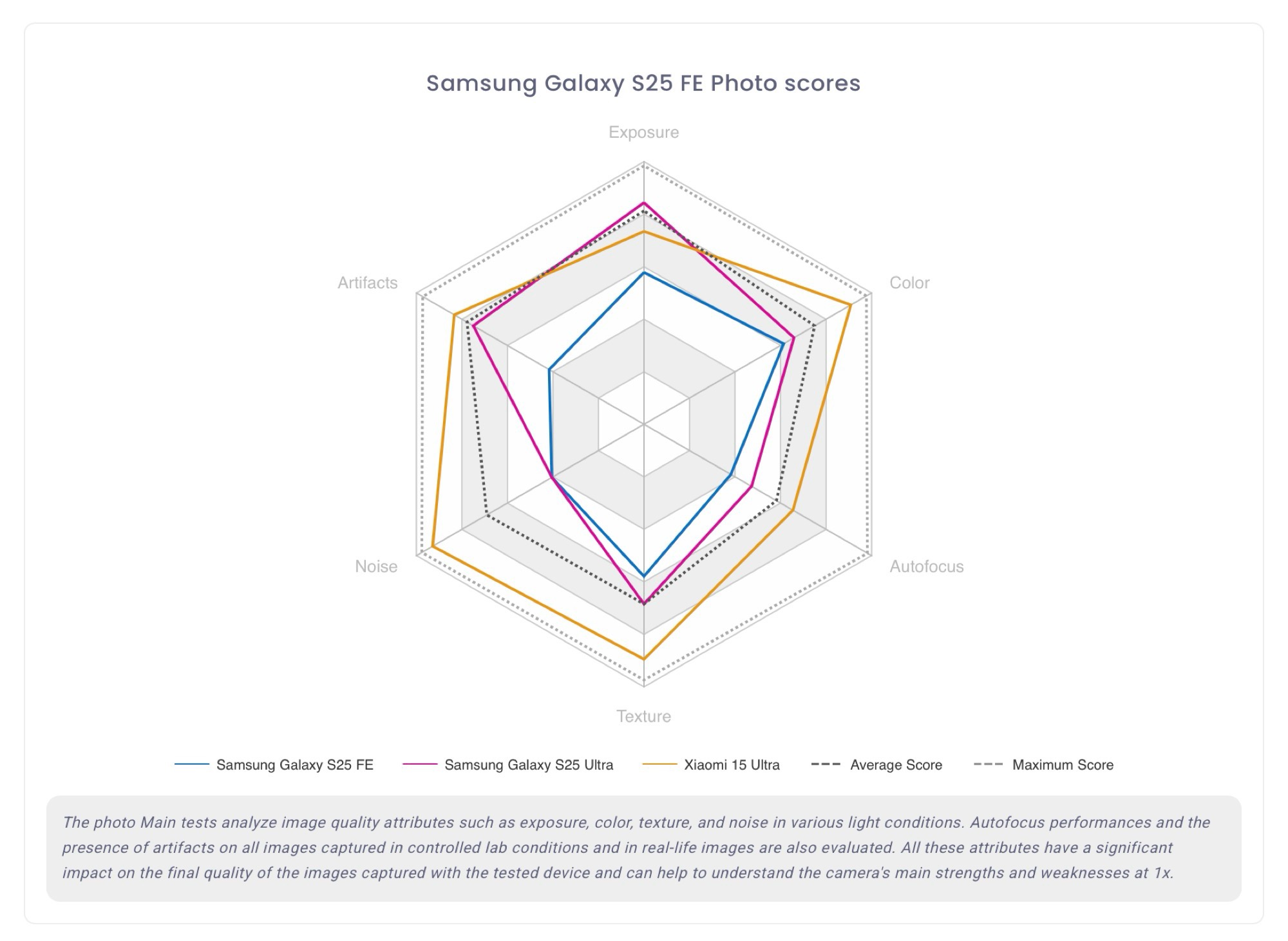 La Galaxy S25 FE incluye una cámara principal de 50 MP f/1,8 con un sensor de 1/1,57 pulgadas, una cámara ultra gran angular de 12 MP f/2,2 con un diminuto sensor de 1/3 de pulgada y una cámara teleobjetivo de 8 MP f/2,2 con un sensor aún más pequeño de 1/4,4 pulgadas y zoom óptico 3x. El análisis en profundidad de la cámara de DxOMark ha revelado ahora el alcance real de los compromisos de esta configuración de triple cámara. Con una puntuación de 118, la Galaxy S25 FE se sitúa en el puesto 123 de la clasificación global https://www.dxomark.com/smartphones/ - superado incluso por el iPhone 12 Pro Max de cinco años Apple (131 puntos) y el más asequible Google Pixel 6a (122 puntos)