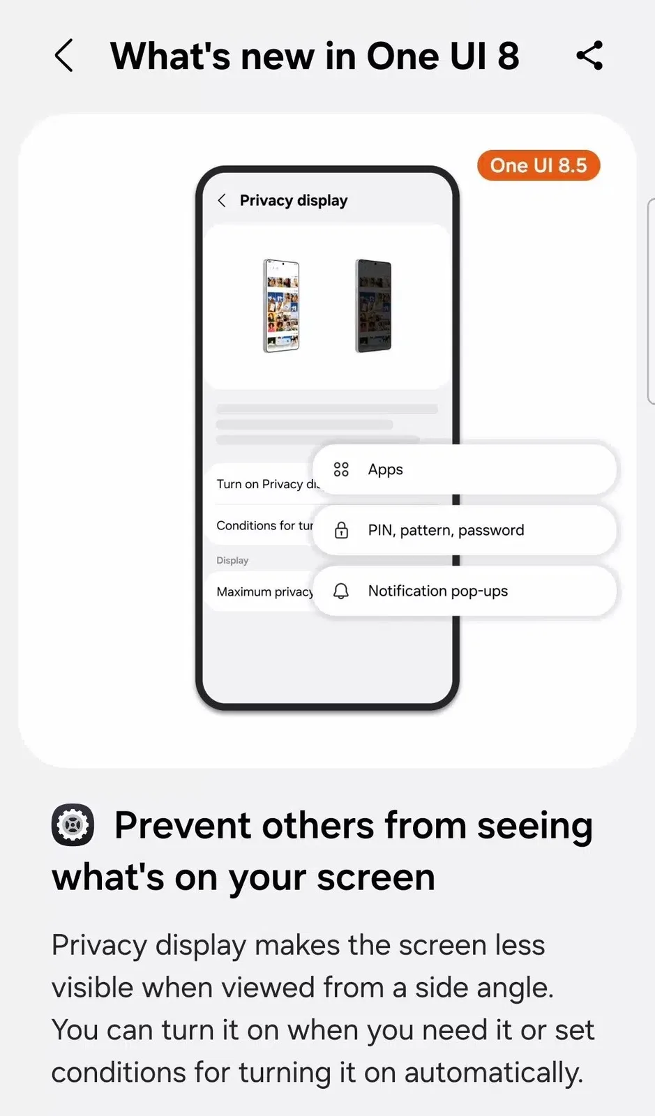 La llamada pantalla de privacidad pretende simular un protector de pantalla que restringe significativamente los ángulos de visión para dificultar que los curiosos cercanos vean datos privados. En octubre de 2025 ya se filtraron unas primeras capturas de pantalla del cuadro de diálogo de ajustes de la nueva función de pantalla, y ahora la aplicación Tips también ha desvelado la descripción oficial de esta característica:
