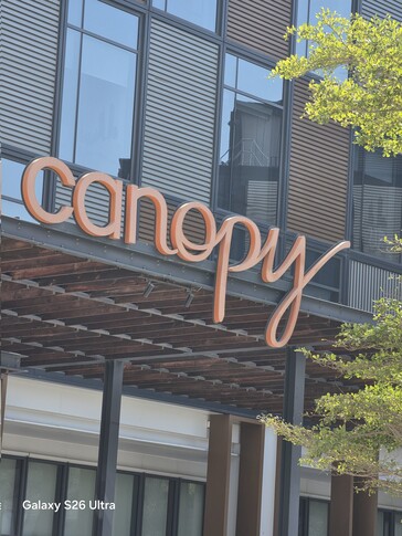 En primer lugar, el Galaxy S26 Ultra se enfrentó al iPhone 17 Pro Max. Las imágenes capturadas con sus respectivas cámaras principales y teleobjetivos (5x en el Galaxy S26 Ultra y 4x en el iPhone 17 Pro Max) demuestran una vez más que Samsung opta por una ciencia del color comedida pero más realista, un punto destacado por el filtrador y crítico de Samsung Ice Universe en un post de reacción en https://x.com/UniverseIce/status/2026335765660422144. En la toma con teleobjetivo del logotipo del hotel, Apple proporcionó un contraste significativamente mayor, mientras que la interpretación de Samsung parece más cercana a cómo se ve el sujeto en la realidad, aunque puede requerir algo de edición para destacar en las redes sociales