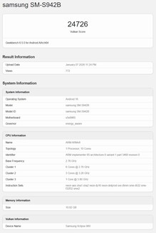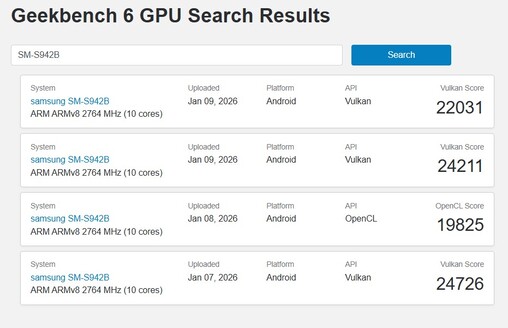Los dispositivos de prueba Samsung Exynos 2600 ya aparecieron en Geekbench en el pasado y dieron una indicación del rendimiento esperado de la CPU. Ahora, un smartphone Samsung con el número de modelo SM-S942B también ha aparecido en la base de datos de Geekbench https://browser.geekbench.com/search?k=v6_compute&q=SM-S942B&utf8=%E2%9C%93. Se espera que este modelo sea el internacional Galaxy S26. Como puede verse en las especificaciones, incorpora un SoC de 10 núcleos con el Samsung Xclipse 960, lo que significa claramente que se trata del Exynos 2600. Esto también es una pista bastante obvia de que el Galaxy S26 europeo contará con el procesador interno de Samsung.