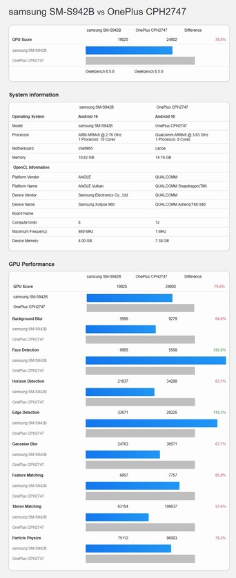 En este caso, no se trata de un benchmark de CPU, sino de una prueba de GPU Vulkan y OpenCL. En las primeras unidades de prueba, esta unidad gráfica se acercó bastante al Snapdragon 8 Elite Gen 5, que se encuentra en el OnePlus 15(desde 999 dólares en Amazon) y otros teléfonos de Android. La comparación no es del todo justa, ya que es probable que el Samsung Galaxy S26 obtenga más rendimiento en las próximas semanas a través de optimizaciones de software. Aun así, la GPU Xclipse 960 ya ofrece un 88% del rendimiento de la GPU Adreno 840 en Vulkan, o algo menos del 80% en OpenCL.