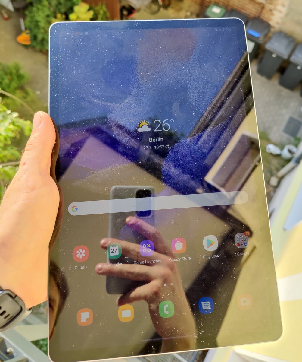 A pesar de la gran pantalla de 12,4 pulgadas, la Galaxy Tab S7 FE es delgada, con unos 6 milímetros, pero pesa más de 30 gramos más que una Tab S7 Plus. Con 608 gramos, sostener la tableta cómodamente con una mano no es posible. Además, el acabado mate de la trasera reduce ligeramente el agarre en manos secas. A cambio, las huellas dactilares grasientas se disimulan muy bien.