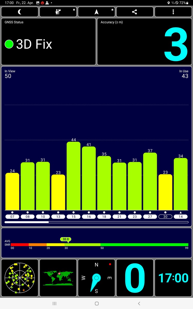 Los servicios de posicionamiento compatibles son GPS (L1), Galileo (E1), BeiDou, GLONASS y SBAS. El bloqueo de los satélites en interiores se obtiene muy rápidamente con una precisión de unos 4 m.