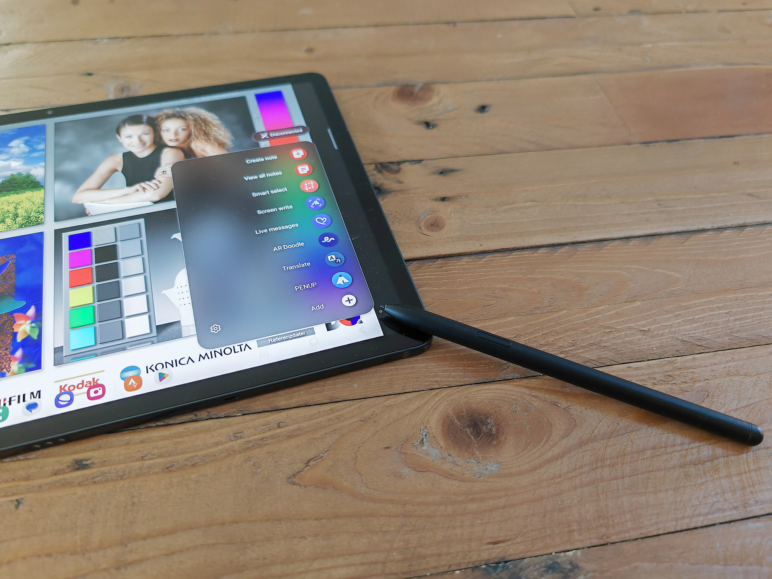 El lápiz de entrada se puede acoplar magnéticamente a la tableta Galaxy en una ranura de la parte trasera, donde también se carga. Se conecta a la tableta a través de Bluetooth y de esta forma también se puede utilizar para la introducción de gestos. Además, hay un botón en el lápiz que abre por defecto el menú de acceso rápido, pero también puede utilizarlo para otras funciones en las aplicaciones compatibles.