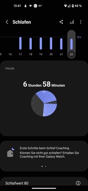 El Samsung Galaxy Watch5 Pro cuenta con seguimiento del sueño. Si se desea, el reloj puede vigilar el pulso y la saturación de oxígeno durante la noche. También detecta de forma fiable las fases de vigilia. El smartwatch distingue entre las diferentes fases del sueño, como el sueño REM, el sueño profundo y el sueño ligero. El reloj indica tanto el tiempo total de sueño como los tiempos en las respectivas fases, así como la proporción de las fases en el tiempo total en forma de porcentaje.