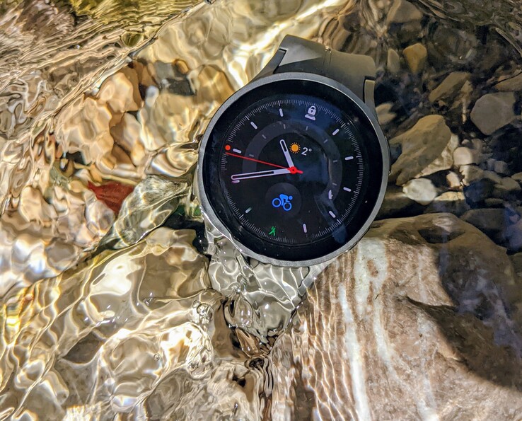 El Galaxy Watch5 Pro sólo está disponible en un tamaño con un diámetro de caja de 45 milímetros. Pesa 76 gramos con la correa D-Buckle Sport en la báscula de pruebas, y la caja sola pesa 47 gramos. El reloj no sufrió ningún daño durante la prueba. Sólo la hebilla de titanio de la pulsera, que toca constantemente la mesa o el ordenador portátil cuando se escribe en un teclado, recibió algunas marcas durante el uso.