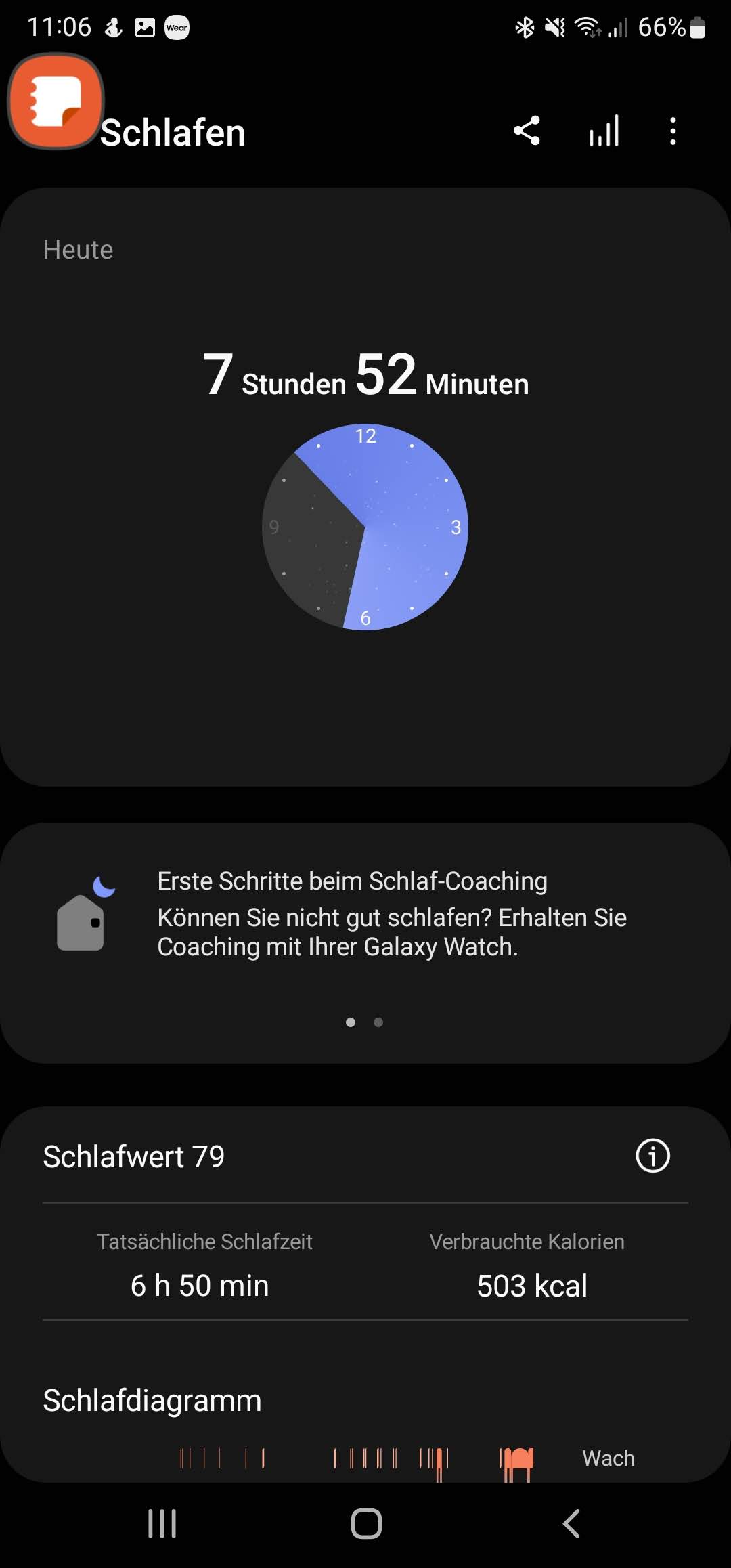 La visualización de la aplicación Salud es aún más amplia: se indican los tiempos totales de sueño, así como los tiempos transcurridos en cada una de las fases del sueño. Los datos también se muestran de forma gráfica. Los datos de la noche anterior también pueden compararse con los de otras noches para examinar las tendencias. Samsung también ofrece entrenamiento para mejorar la calidad del sueño si el reloj se usa durante al menos siete noches seguidas.