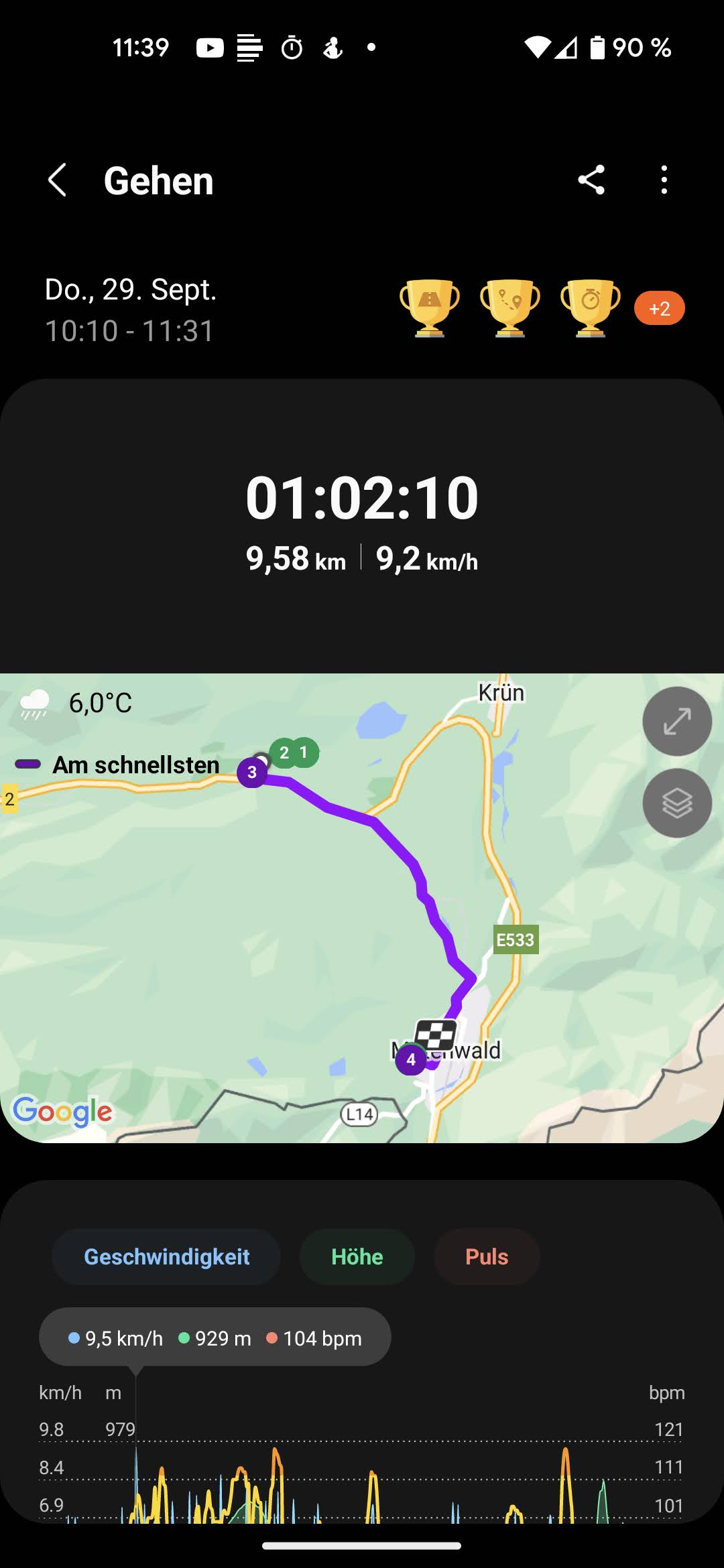 Si lo desea, el Galaxy Smartwatch también puede ofrecer un informe de estado intermedio después de haber cubierto ciertos tiempos o distancias. La información sobre la frecuencia cardíaca y el tiempo requerido para el último kilómetro al correr se muestra tanto visualmente en la pantalla como en forma de anuncio por el altavoz. Además, la aplicación Health App muestra los tiempos y los datos por kilómetro e indica el valor de VO2máx.