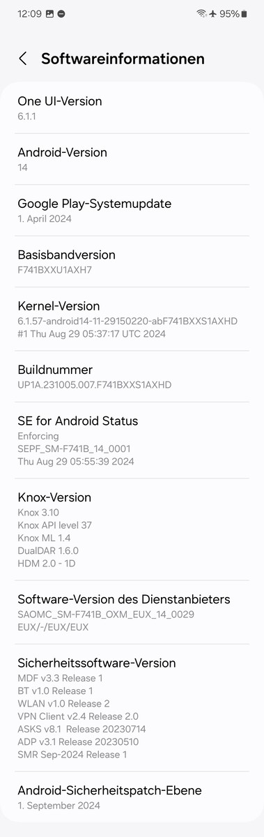 Samsung también está ampliando la garantía de actualización para sus teléfonos plegables a siete años (hasta el 31 de julio de 2031). En el momento de las pruebas, los parches de seguridad eran del 1 de septiembre de 2024, lo que significa que están totalmente al día. El Flip6 sólo se queda un poco rezagado en lo que respecta a las actualizaciones del sistema Play.